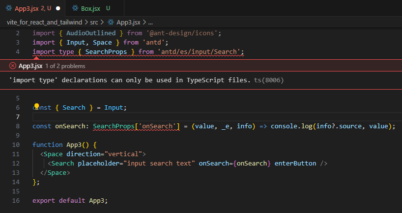 ■ 문제상황보다시피, 해당 소스 파일은 jsx입니다. ts 또는 tsx 파일이 아닌 곳에서 TypeScript에서만 쓸 수 있는 import type 구문을 사용해서 나타난 오류입니다. VS Code에서 설정에 따라, JS 개발에 대한 유효성을 검사하는 기능이 있기 때문에 이를 비활성화 해주면 해결됩니다.🗨️ 'import type' 구문은 뭔가요?TypeScript에서 'import type' 구문은 실제 값들을 가져오지 않고 타입이나 인터페이스만을 가져오기 위해 사용됩니다. 이 기능은 TypeScript 3.8 버전부터 사용할 수 있습니다.■ 해결방법❎ (비추천) VS Code의 확장 프로그램 비활성화확장 프로그램을 비활성화하면 VS Code에서 JS 개발에 관련된 유효성 검사를 모두 비활성화하는 ..